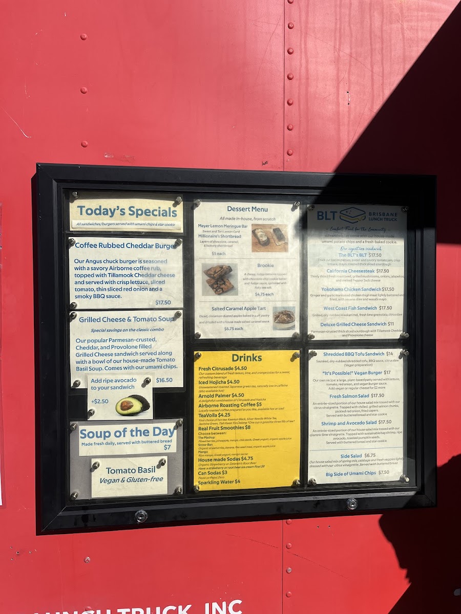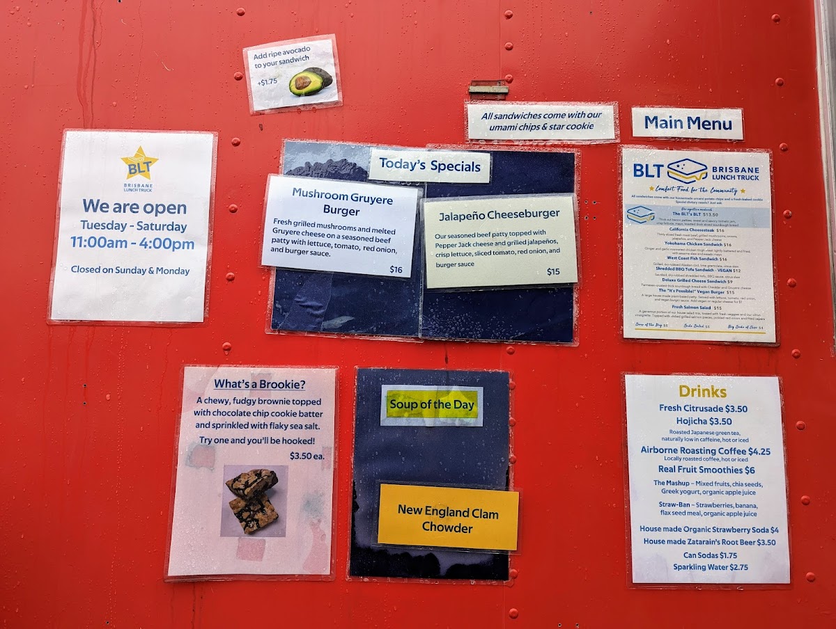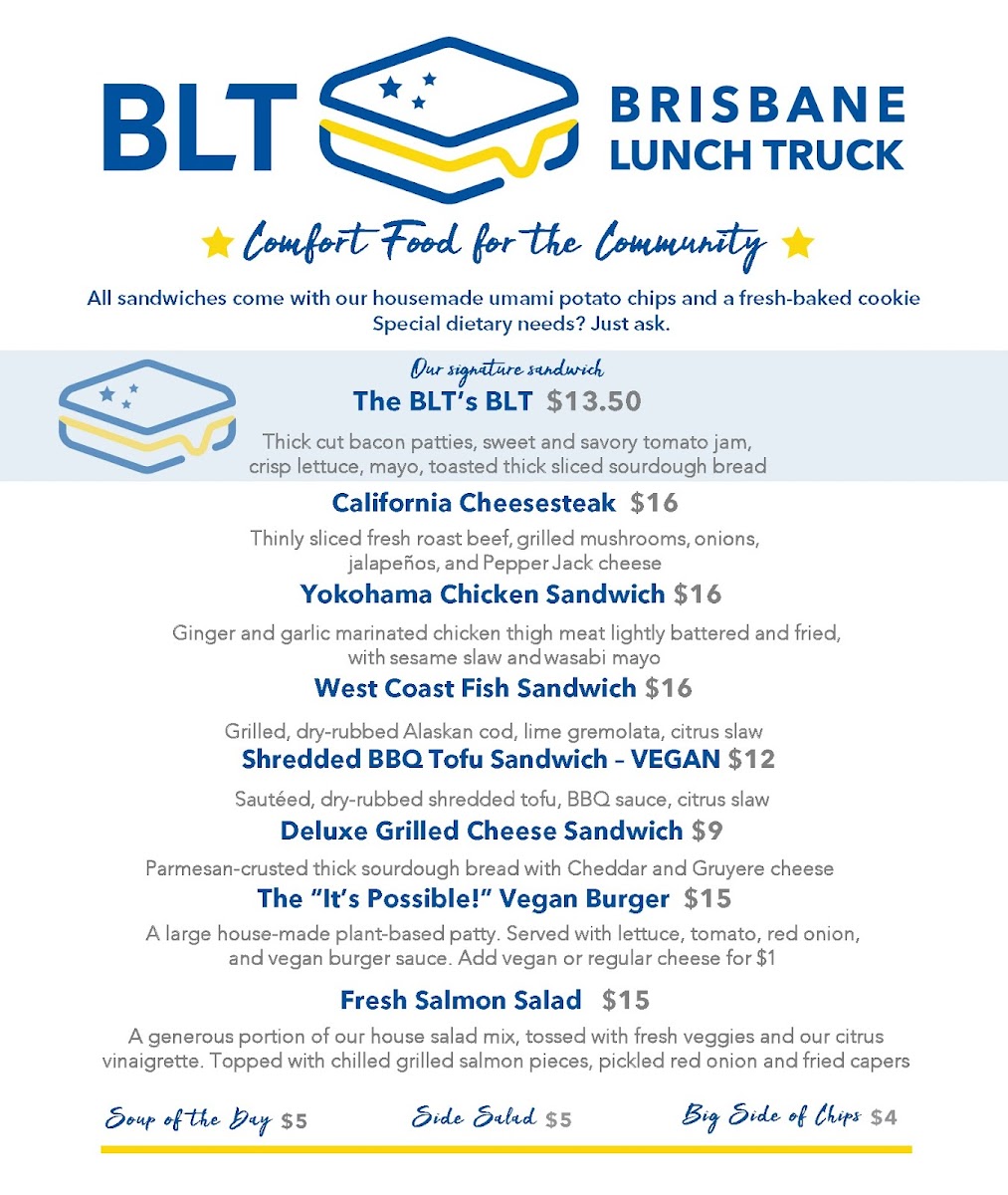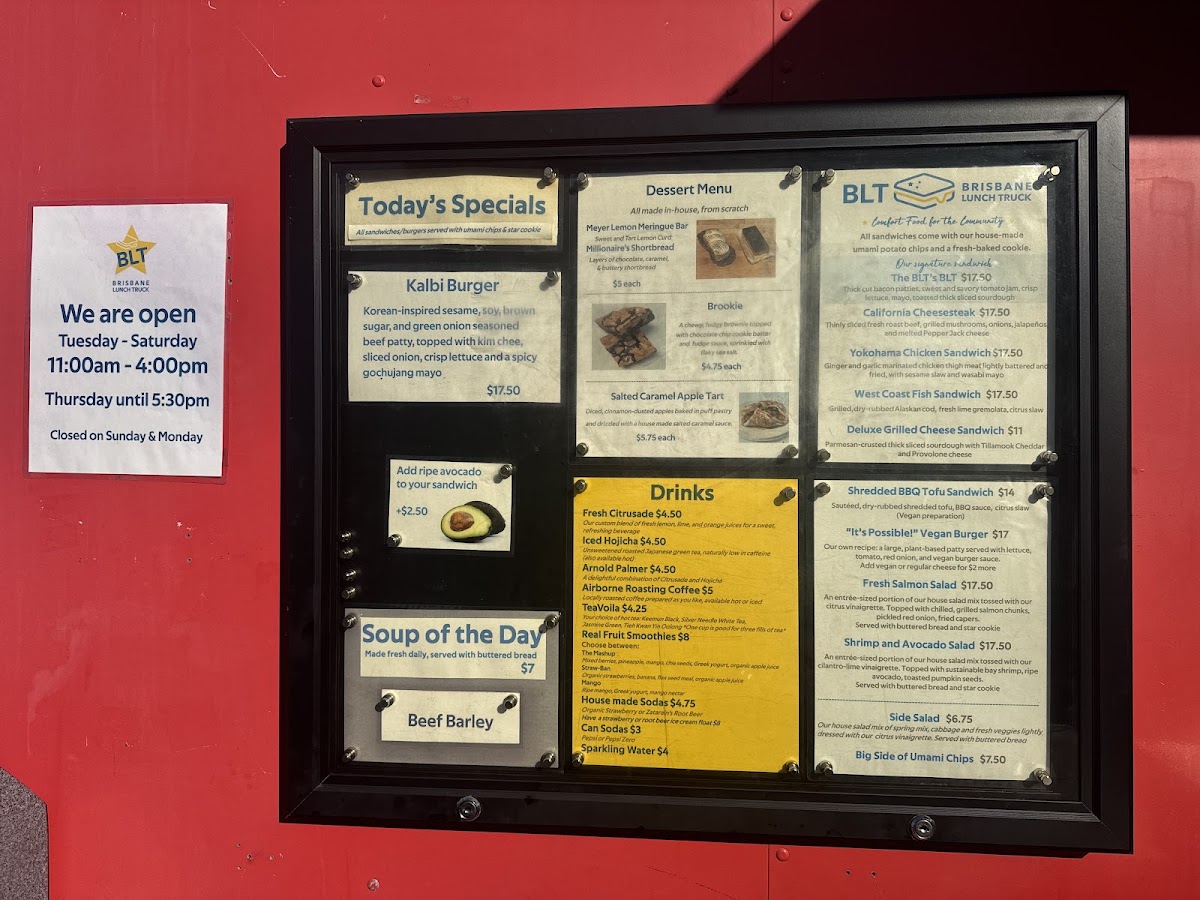 Wrapping up a visit to Brisbane Lunch Truck at 3501 Bayshore Blvd, the menu leaves a distinctly satisfying impression with its mix of hearty sandwiches, inventive burgers, and fresh sides. Sandwich lovers can enjoy the indulgent BLT's BLT, the savory California Cheesesteak, or the comforting Deluxe Grilled Cheese, alongside the plant-forward BBQ Tofu Sandwich. Burger enthusiasts are treated to the playful "It's Possible" Vegan Burger, the timeless Classic Cheddar Burger, or the zesty Guacamole Burger. For lighter fare, the menu offers a range of salads and sides, from the crisp Fresh Salmon Salad and Shrimp and Avocado Salad to a Big Side of Chips, Side Salad, and a rotating Soup of the Day. On Saturdays, the special menu brings a fun variety with Yokohama Chicken Bites Bento, Teriyaki Salmon Bento, Teriyaki Chicken Bento, Teriyaki Tofu Bento, and the iconic SPAM Musubi. Sweet finishes include the indulgent Millionaire's Shortbread and the hybrid Brookie, paired nicely with beverages like Arnold Palmer, Fresh Citrusade, or Airborne Roasting Pour Over Coffee, alongside canned options like Can Pepsi and Can Diet Pepsi. The truck also offers retail items for a flavorful take-home experience, featuring Funke Sweet Honey (8oz), Meyer Lemons, and Tomato Jam Jar (8oz). Overall, the menu balances comfort classics, innovative twists, and fresh seasonal options, providing something for every craving.