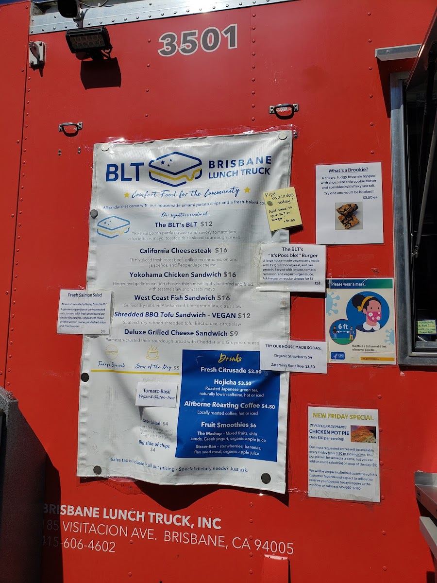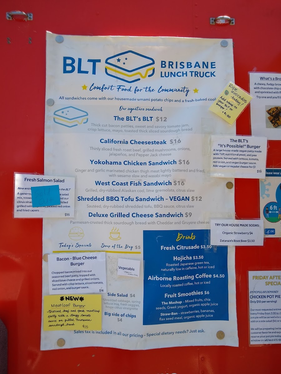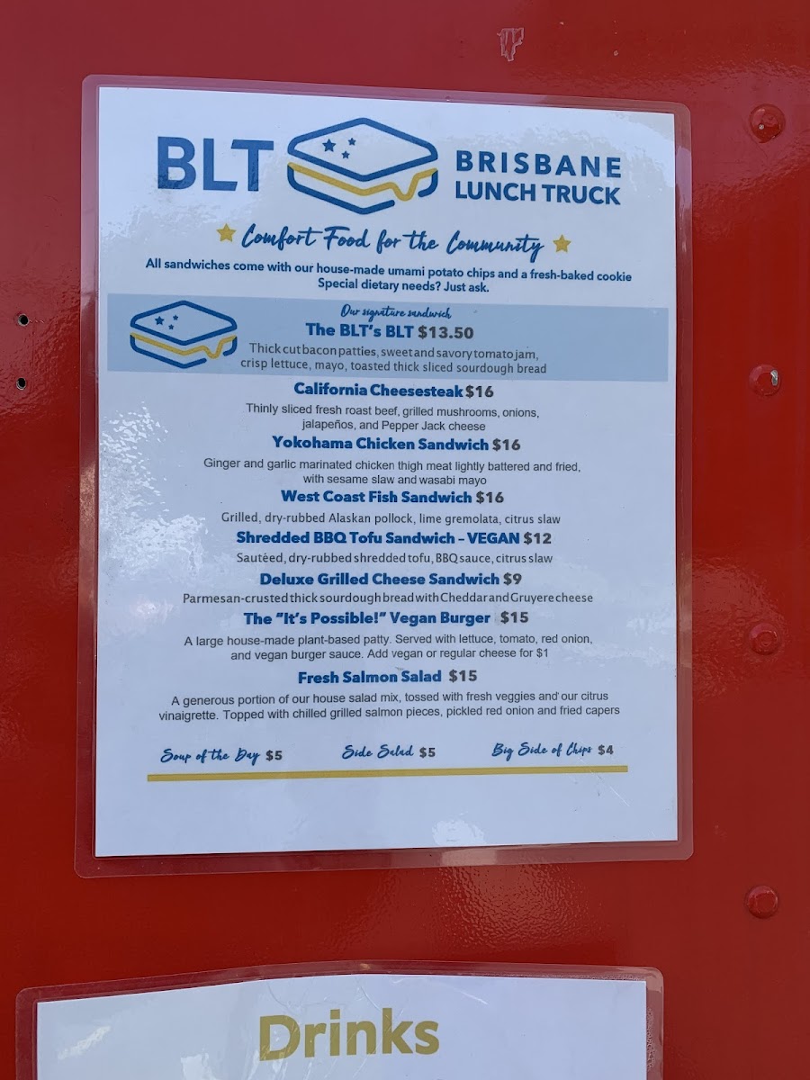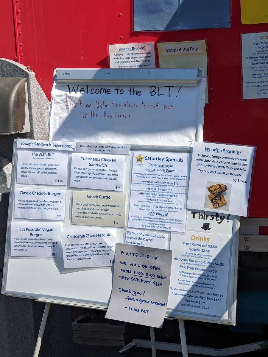Wrapping up a visit to Brisbane Lunch Truck at 3501 Bayshore Blvd, the menu leaves a distinctly satisfying impression with its mix of hearty sandwiches, inventive burgers, and fresh sides. Sandwich lovers can enjoy the indulgent BLT's BLT, the savory California Cheesesteak, or the comforting Deluxe Grilled Cheese, alongside the plant-forward BBQ Tofu Sandwich. Burger enthusiasts are treated to the playful "It's Possible" Vegan Burger, the timeless Classic Cheddar Burger, or the zesty Guacamole Burger. For lighter fare, the menu offers a range of salads and sides, from the crisp Fresh Salmon Salad and Shrimp and Avocado Salad to a Big Side of Chips, Side Salad, and a rotating Soup of the Day. On Saturdays, the special menu brings a fun variety with Yokohama Chicken Bites Bento, Teriyaki Salmon Bento, Teriyaki Chicken Bento, Teriyaki Tofu Bento, and the iconic SPAM Musubi. Sweet finishes include the indulgent Millionaire's Shortbread and the hybrid Brookie, paired nicely with beverages like Arnold Palmer, Fresh Citrusade, or Airborne Roasting Pour Over Coffee, alongside canned options like Can Pepsi and Can Diet Pepsi. The truck also offers retail items for a flavorful take-home experience, featuring Funke Sweet Honey (8oz), Meyer Lemons, and Tomato Jam Jar (8oz). Overall, the menu balances comfort classics, innovative twists, and fresh seasonal options, providing something for every craving.